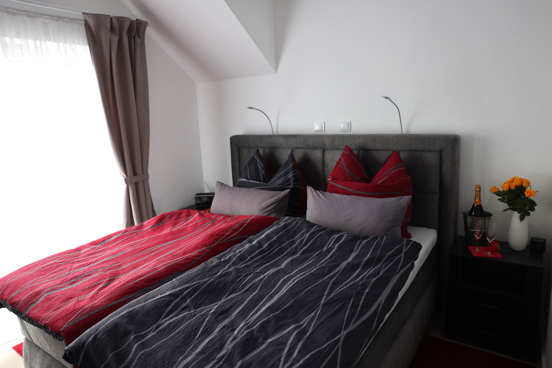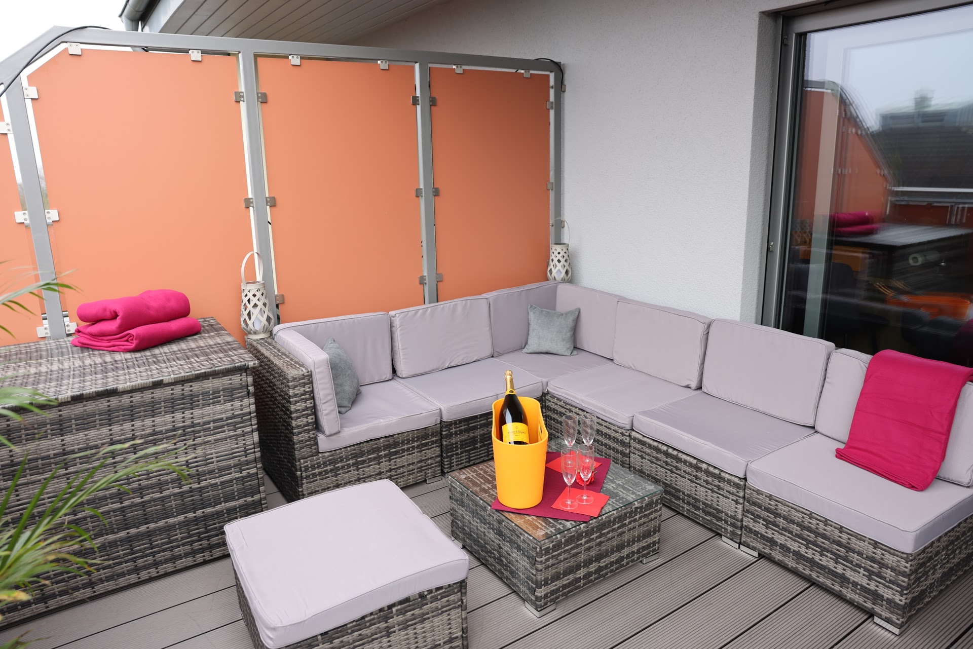 5 Sterne Appartement für 4 - 8 Personen, 1.OG und DG als (Maisonette) ca.105 m2 (voll ausgestattet). 3 Schlafzimmer, 2 Bäder, großes Wohn- Esszimmer, offene Küche und separate Pantry Küche im DG und riesige Balkon Terrasse.