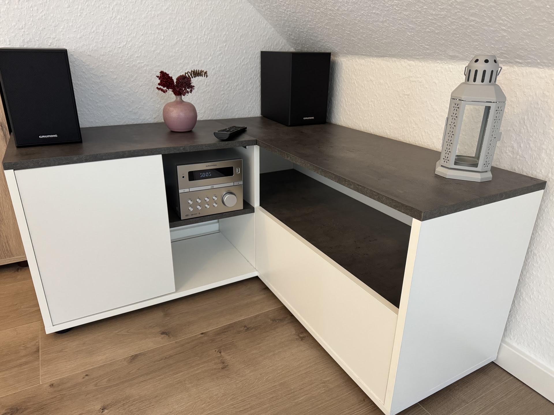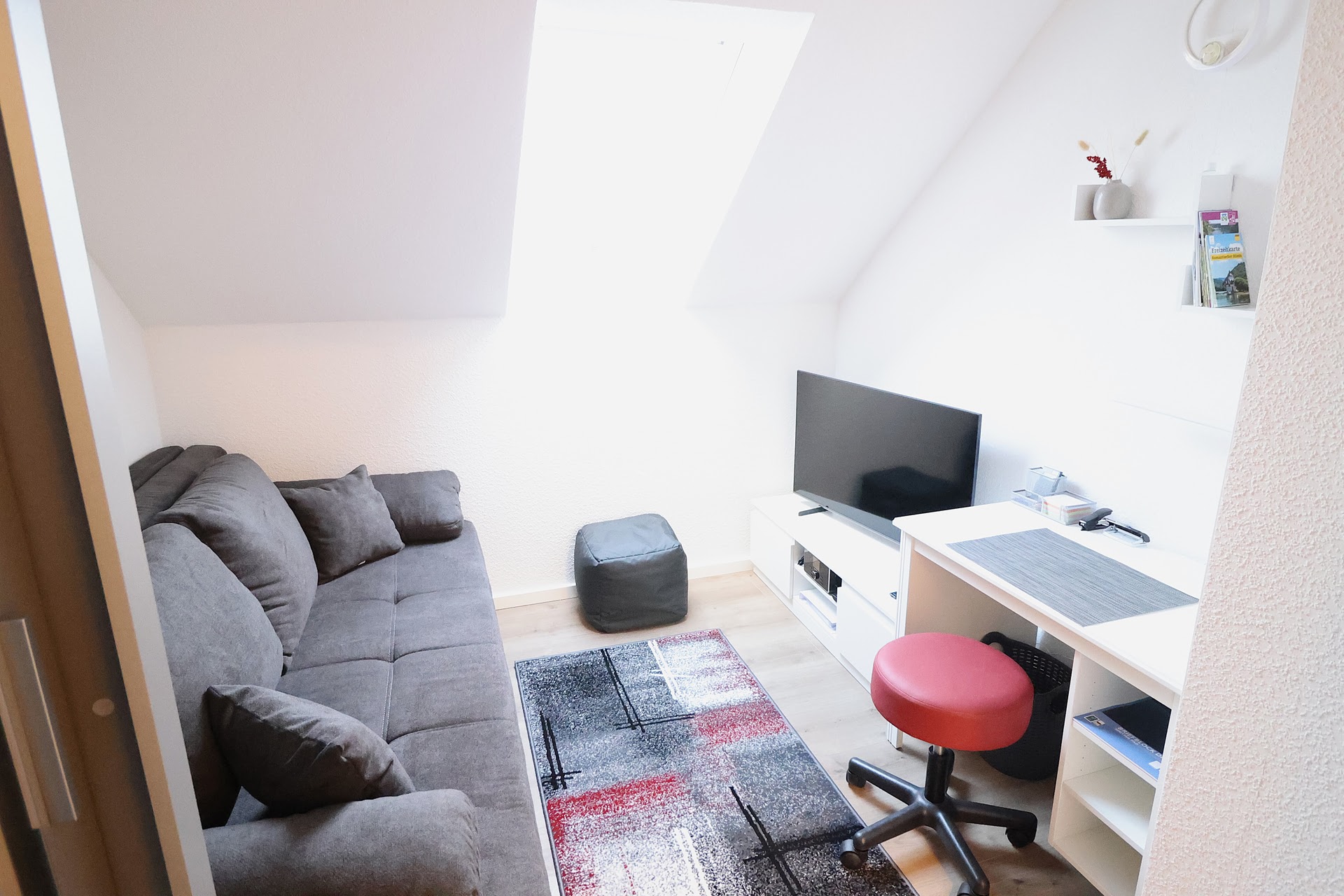 Große Couchlandschaft und Schlafsofa, Smart -TV 4K (55 Zoll) SAT, HiFi-Anlage + CD, Couchtisch, Großes Dachfenster mit Jalousie.