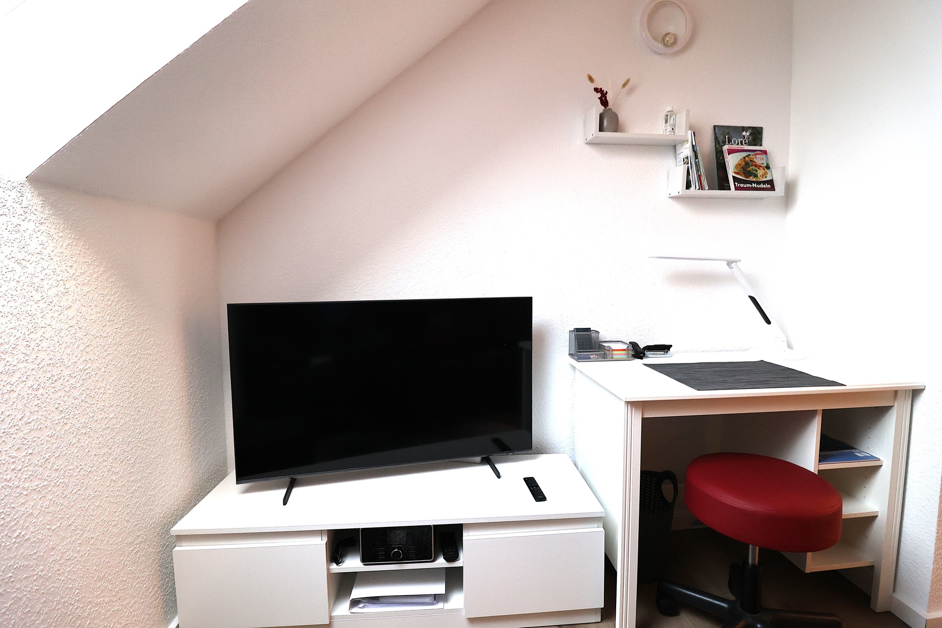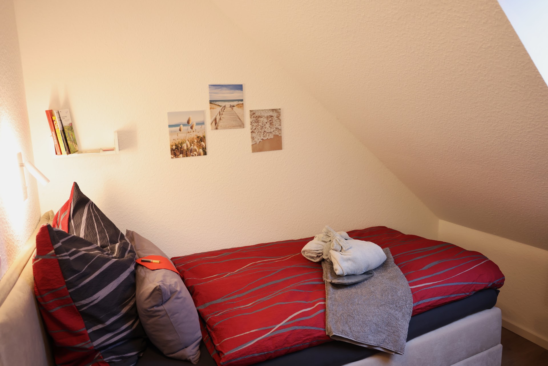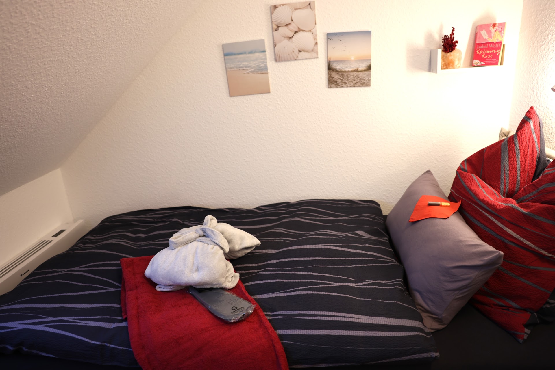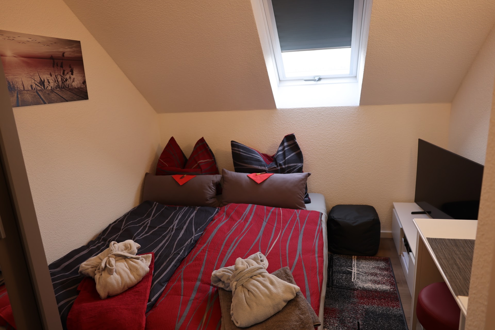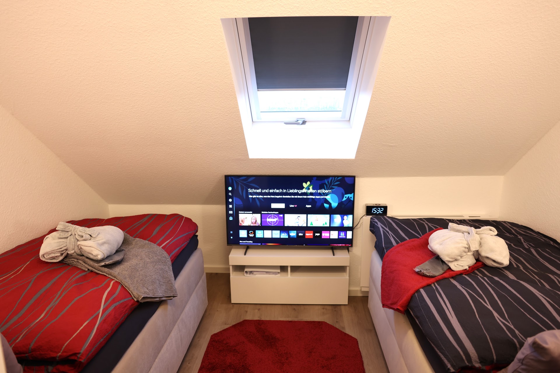 Das 3. Schlafzimmer ist ausgestattet mit zwei hochwertigen Boxspringbetten mit Kaltschaumtopper und Daunendecken jeweils 1,00 x 2,00 m breit, Smart TV 4K (43 Zoll), Weckradio sowie Leseleuchten mit integriertem USB-Anschluss über beiden Betten, Dachfenster mit Öffnungsfunktionen, Verdunklungsrollo.