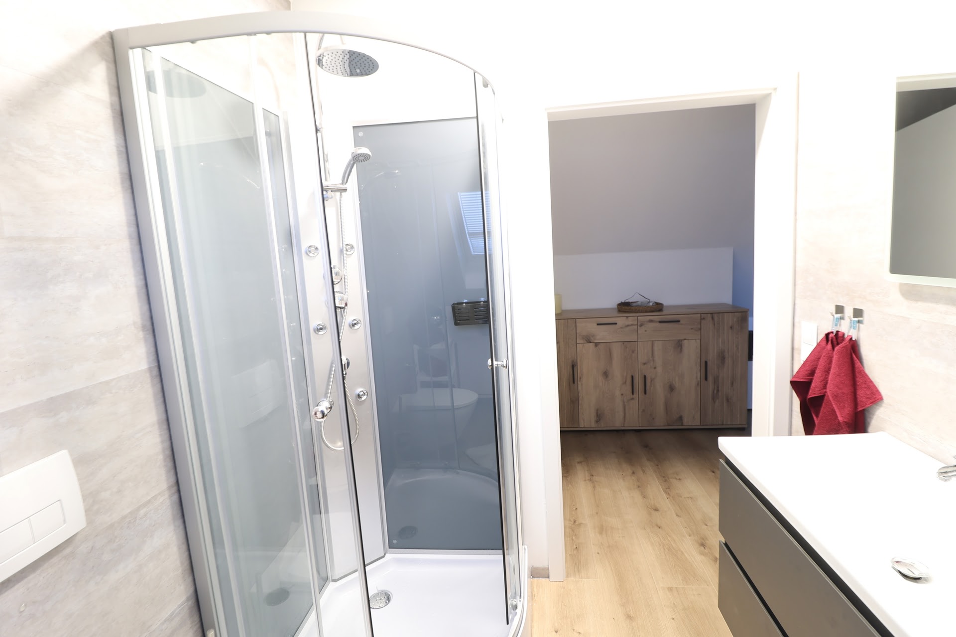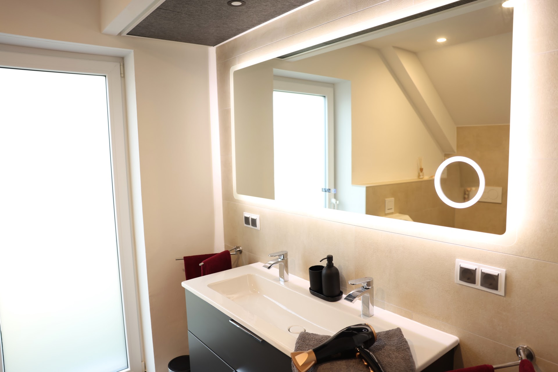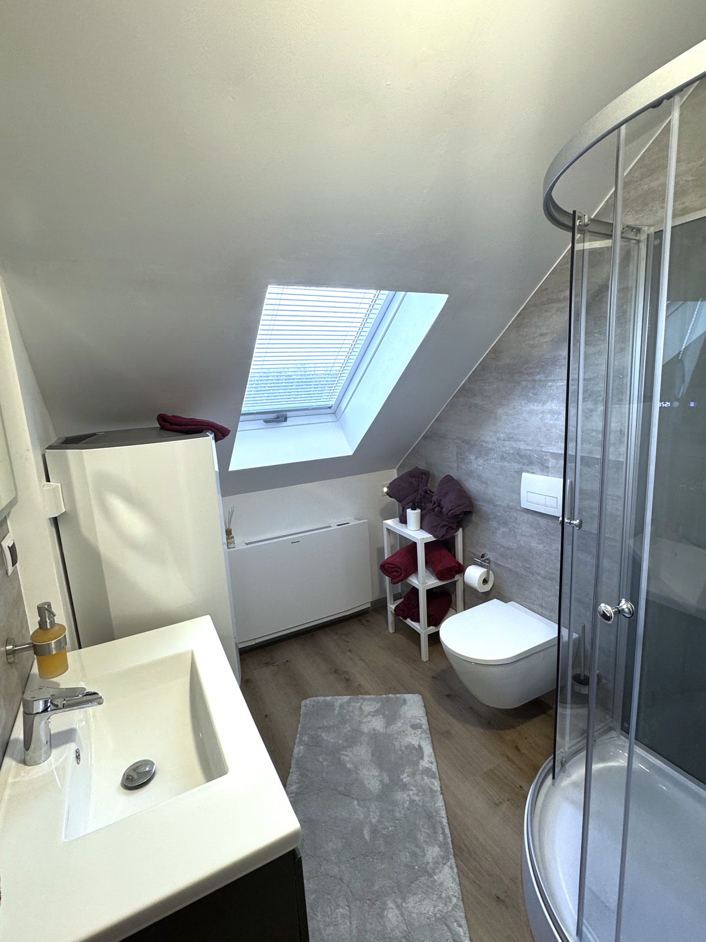 Das 2. Bad ist ausgestattet mit großzügigem 80 cm breiten Waschplatz mit Unterschrank, LED-Spiegel mit integriertem Kosmetikspiegel, Touchsteuerung und Digitaluhr, Föhn, Dusche mit verschiedenen Massagefunktionen und einem Rimless WC, Dachfenster mit Öffnungsfunktionen, Jalousie.