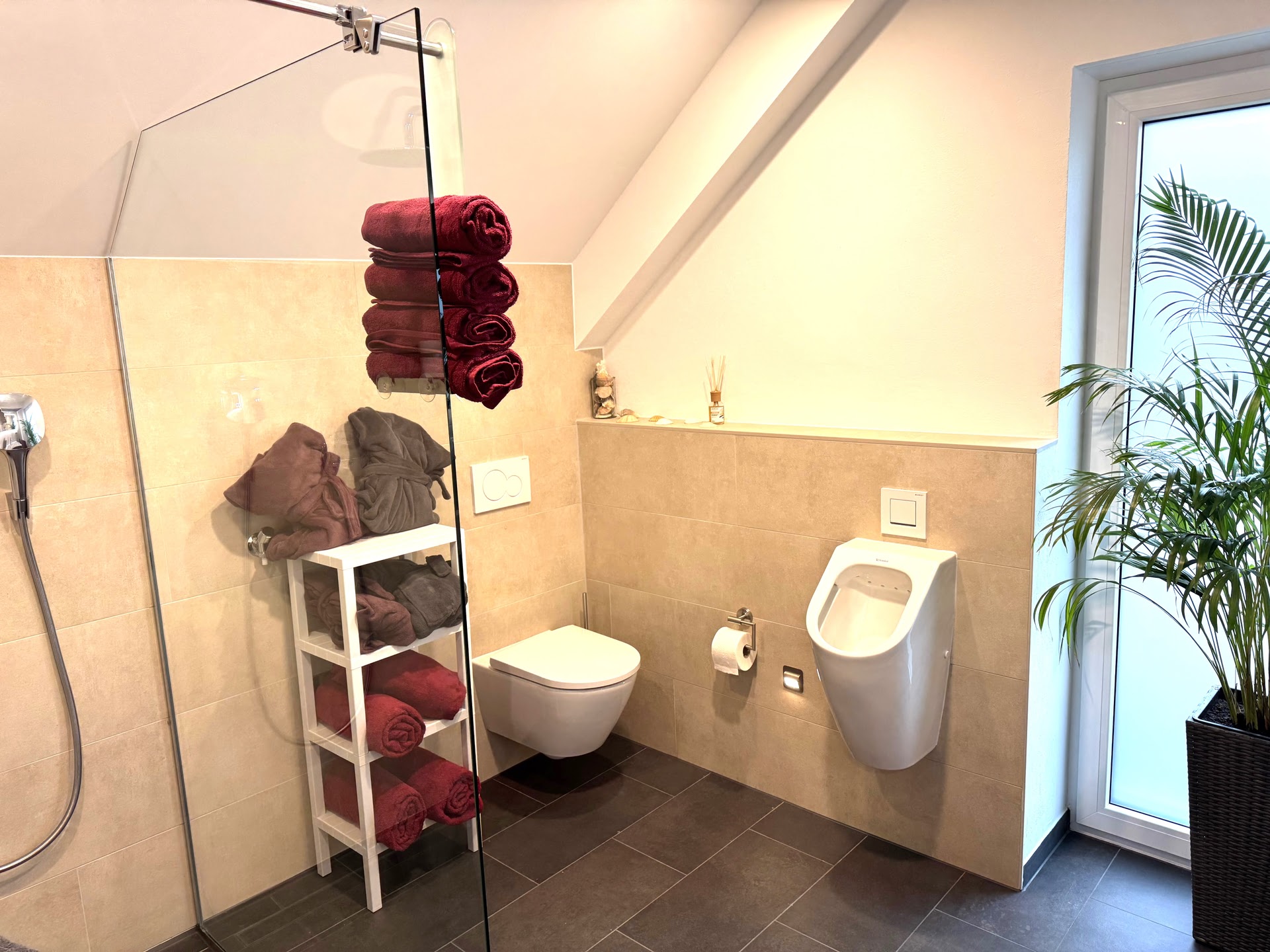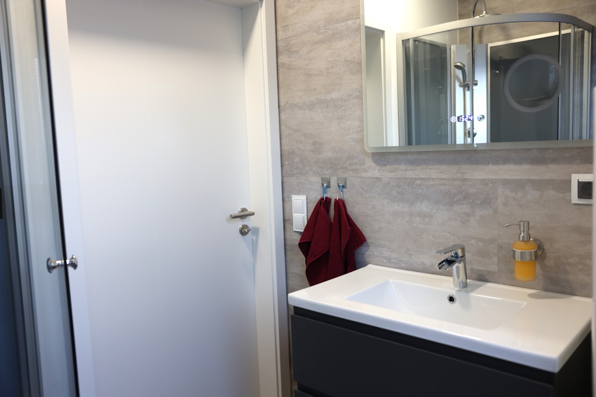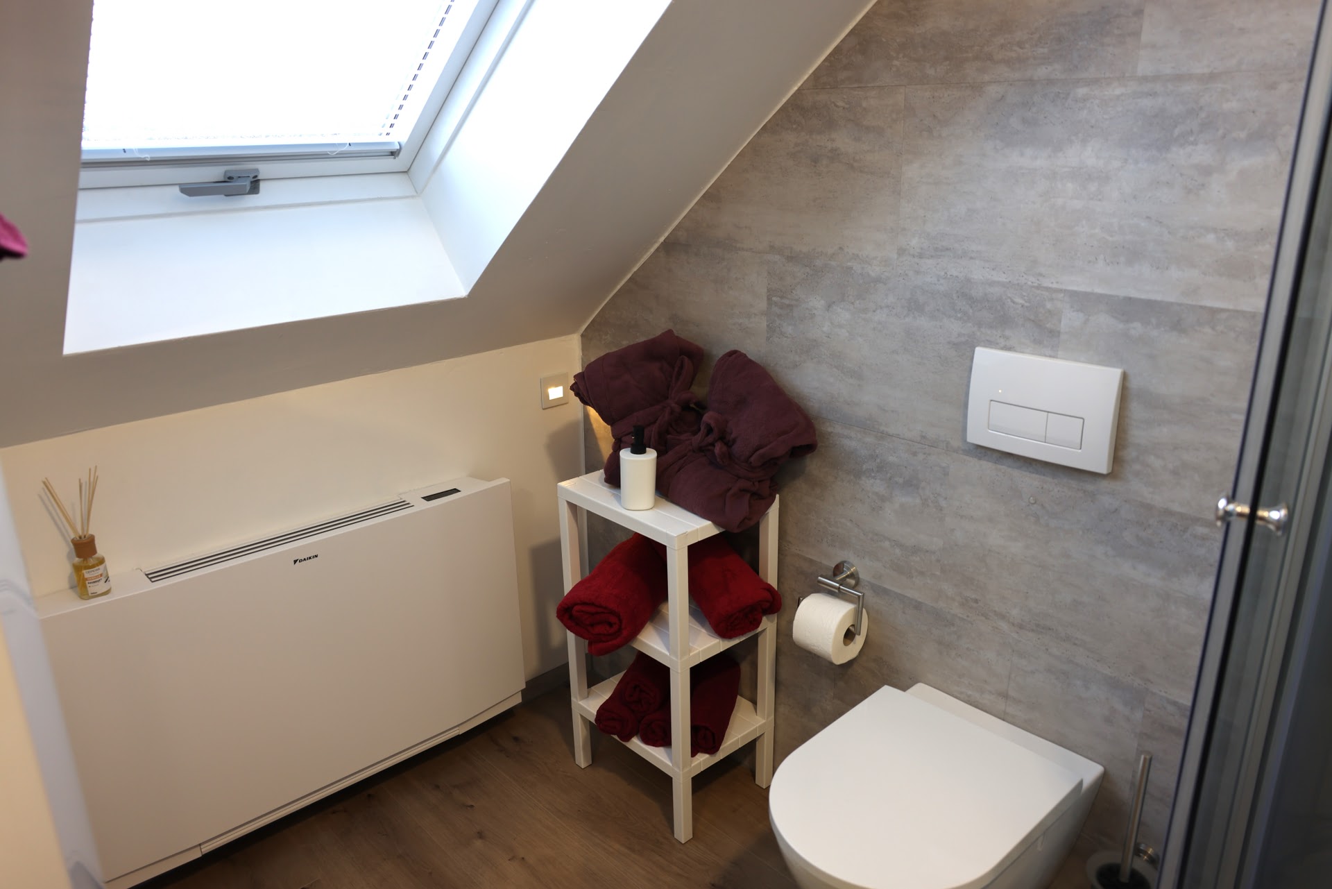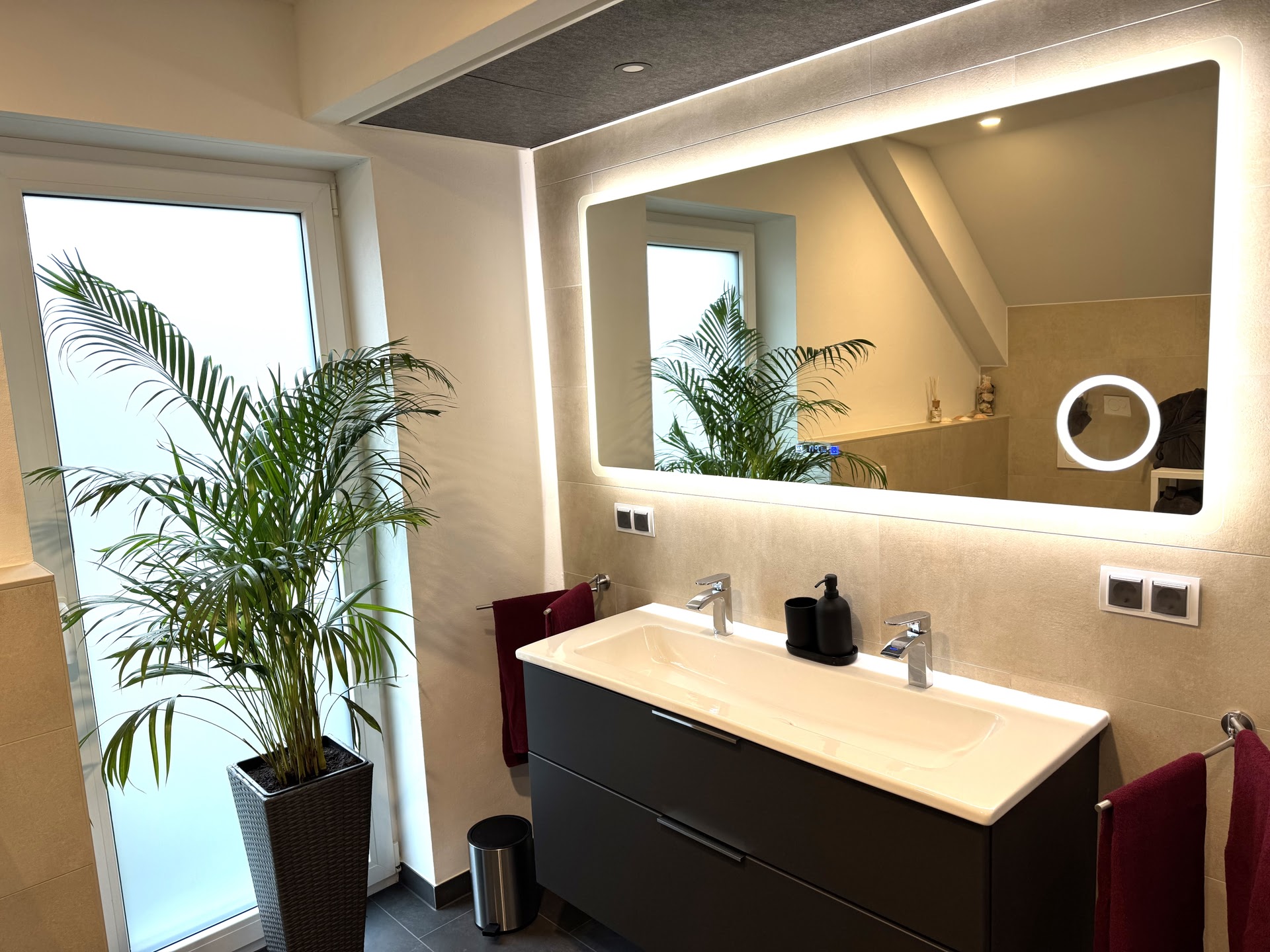 Das 2. Bad ist ausgestattet mit großzügigem 80 cm breiten Waschplatz mit Unterschrank, LED-Spiegel mit integriertem Kosmetikspiegel, Touchsteuerung und Digitaluhr, Föhn, Dusche mit verschiedenen Massagefunktionen und einem Rimless WC, Dachfenster mit Öffnungsfunktionen, Jalousie.