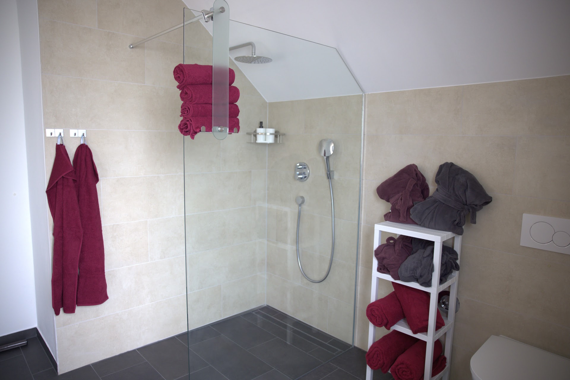 Walk in Wall Raindance Dusche, bodengleich, Rimless-WC, Doppelwaschtisch mit Unterbauschrank, Badspiegel mit integriertem Makeup Spiegel, Digitaluhr, indirekte Beleuchtung mit Touchschalter, Föhn etc., ausreichende Anzahl an Handtücher und Hygieneartikel werden kostenfrei bereitgestellt, französischer Balkon mit Glasgeländer.