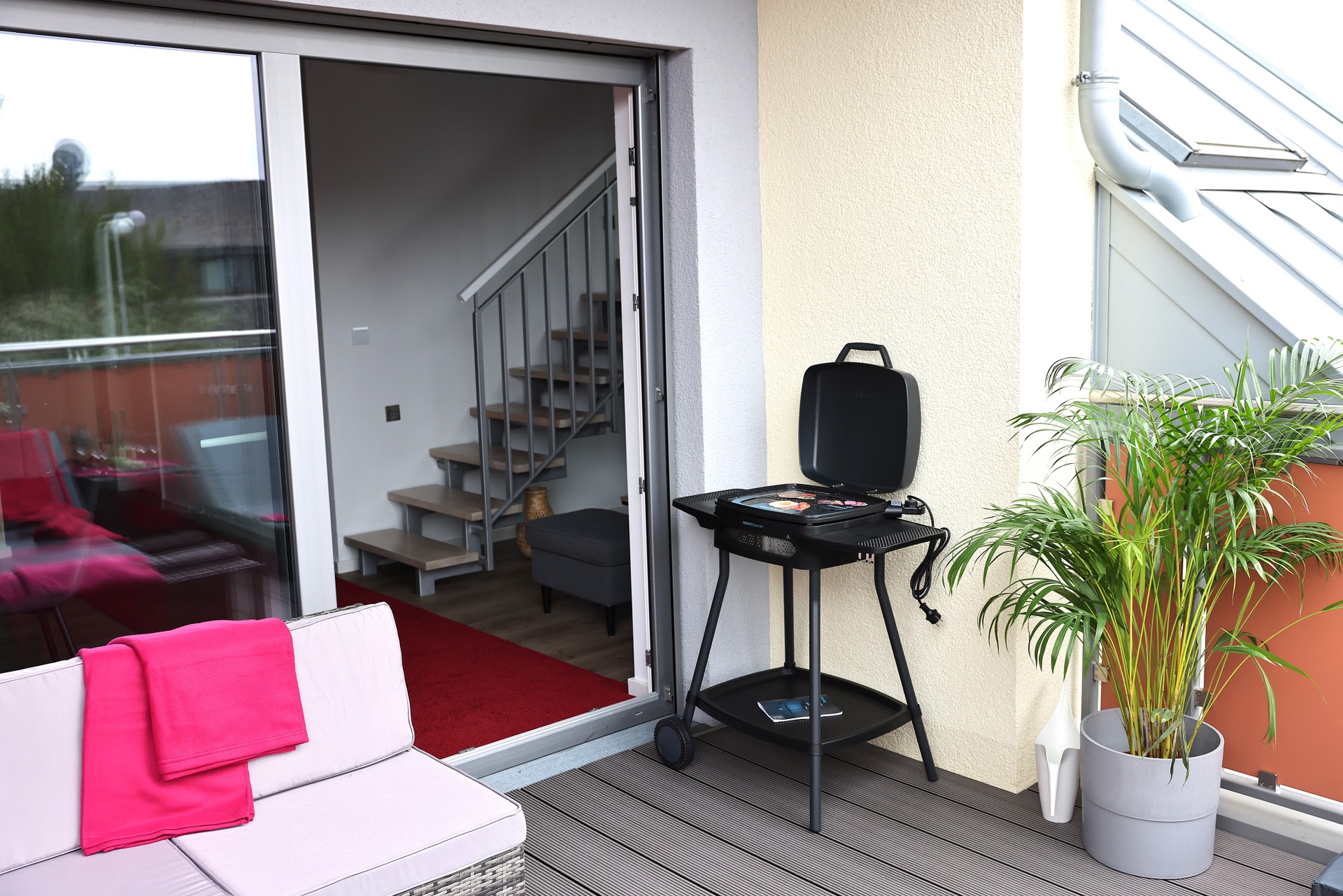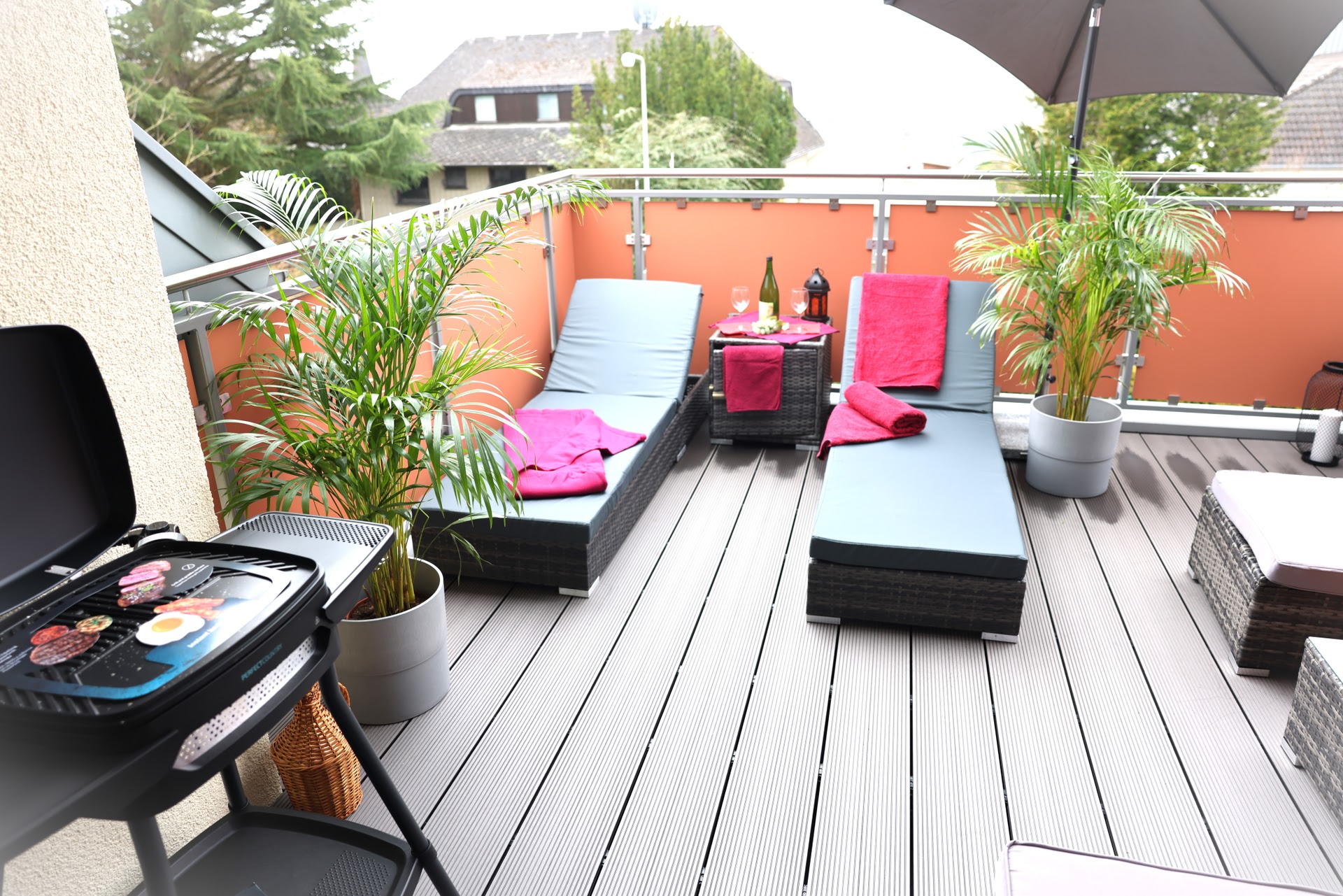 Teilüberdachte Balkon-Sonnenterrasse (19 m2) mit Lounge-Möbeln, Sonnenliegen und großem Elektro Grill.