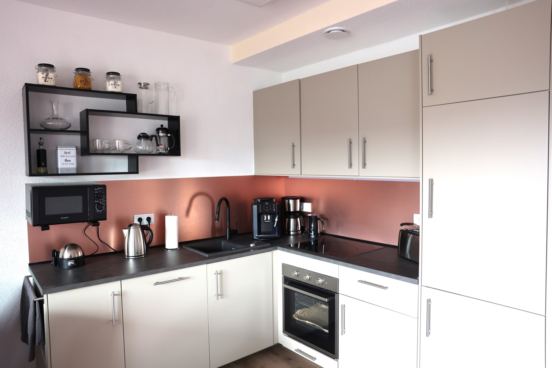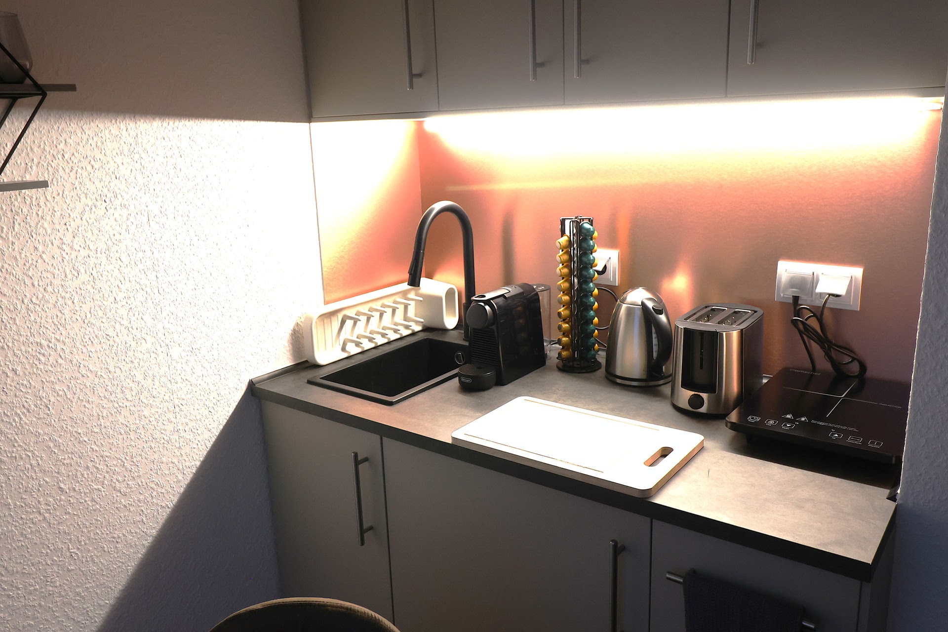 Die vollausgestattete Pantryküche mit Spüle, Kühlschrank, Nesspreso Kapselmaschine, 1x Induktions- Herdplatte, Wasserkocher, Toaster, Geschirr, Küchenhandtücher, Küchenutensilien als Komplettausstattung der Küche.