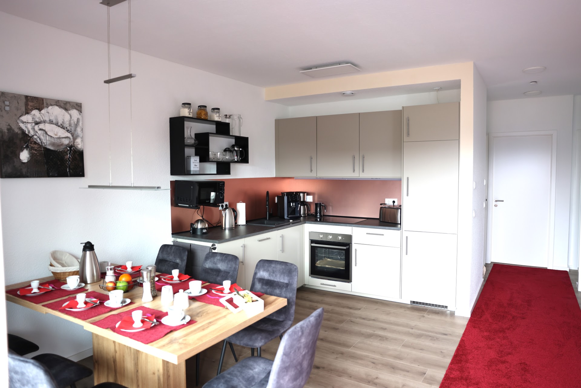 Backofen mit 4 Induktionskochfelder, großer Kühlschrank mit separatem Gefrierschrank, Geschirrspüler, Mikrowelle, Kaffeevollautomat (Bohnen) Filter- Kaffeemaschine (Pulver), Toaster, Wasserkocher, Eierkocher, Mixer, Geschirr, Küchenhandtücher, Küchenutensilien als Komplettausstattung der Küche.